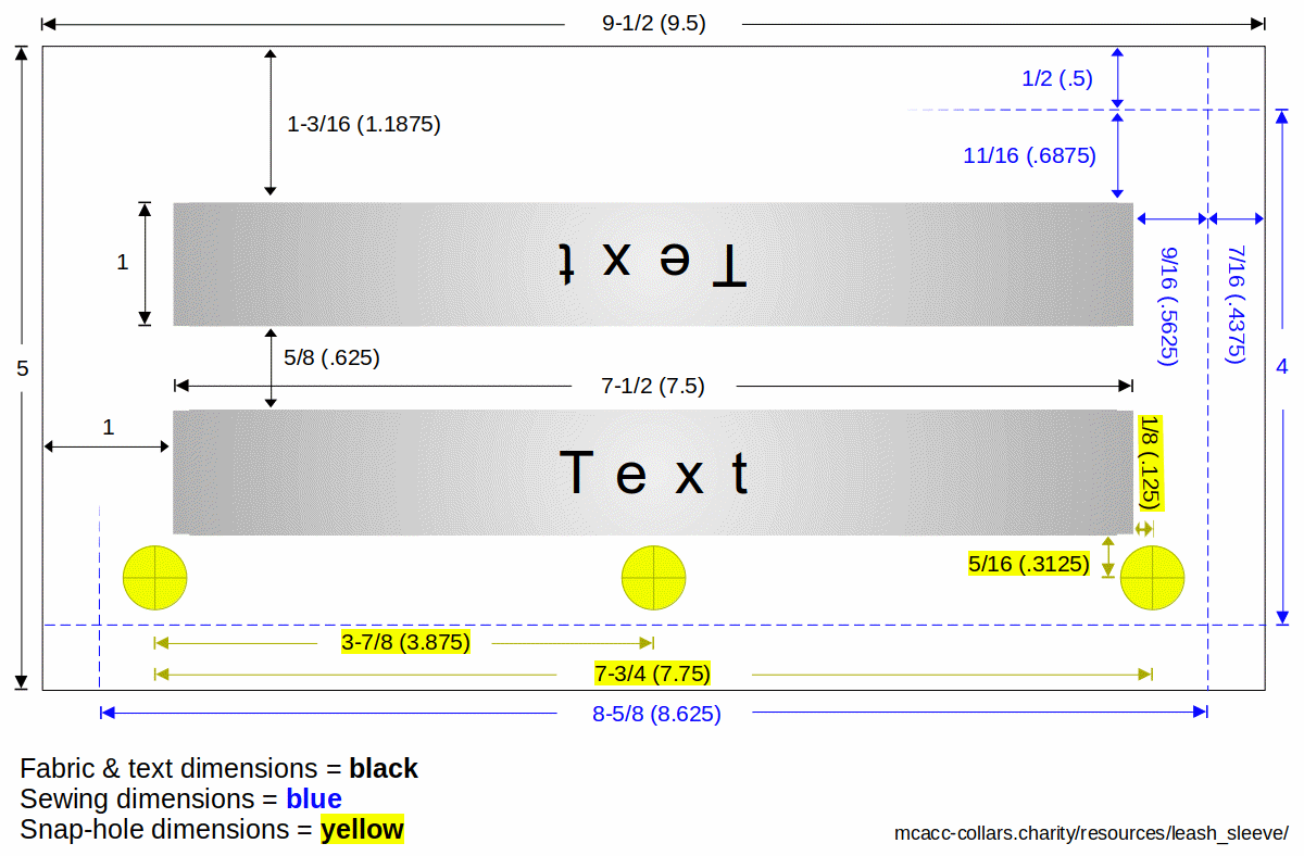 Note: Those paper dimensions are an example of how I shrank my artwork ~4% for printing. The x (horizontal) distance between corner snaps is 7-3/8". The quick-ref dimension is 7-3/4 (3/8 (.375)" longer). But, my y (vertical) distance between snaps remain 3-1/4" (the same as the quick-ref dimension). I kept the y dimension for the snap holes because I want the same grip around the leash.
