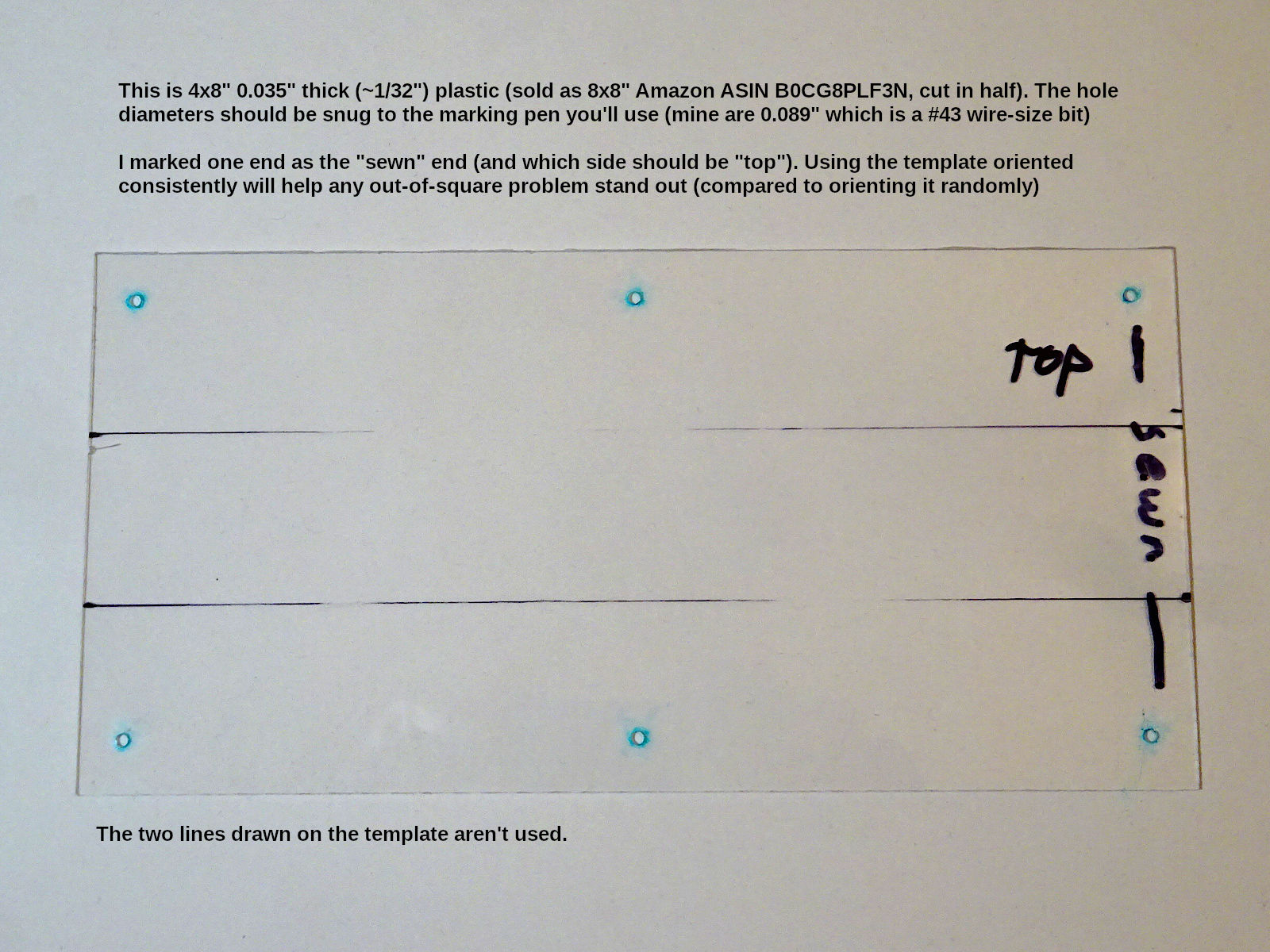The template is made from 8" square clear-plastic (.035" thick, which is about 1/16". Amazon ASIN: B0CG8PLF3N). This is thinner & cheaper than you'll find at the hardware store. If you use something thicker, you have to drill the holes more-perfectly vertical (or be sure to use the side you started the hole from as the bottom side facing the fabric. I.e., where you start the hole should be accurate compared to where it comes out. (I.e., if the drill isn't straight, it will come out a little off center. That side should be where you insert the marking pen. The pen should make contact with the fabric on the side you started the hole.).