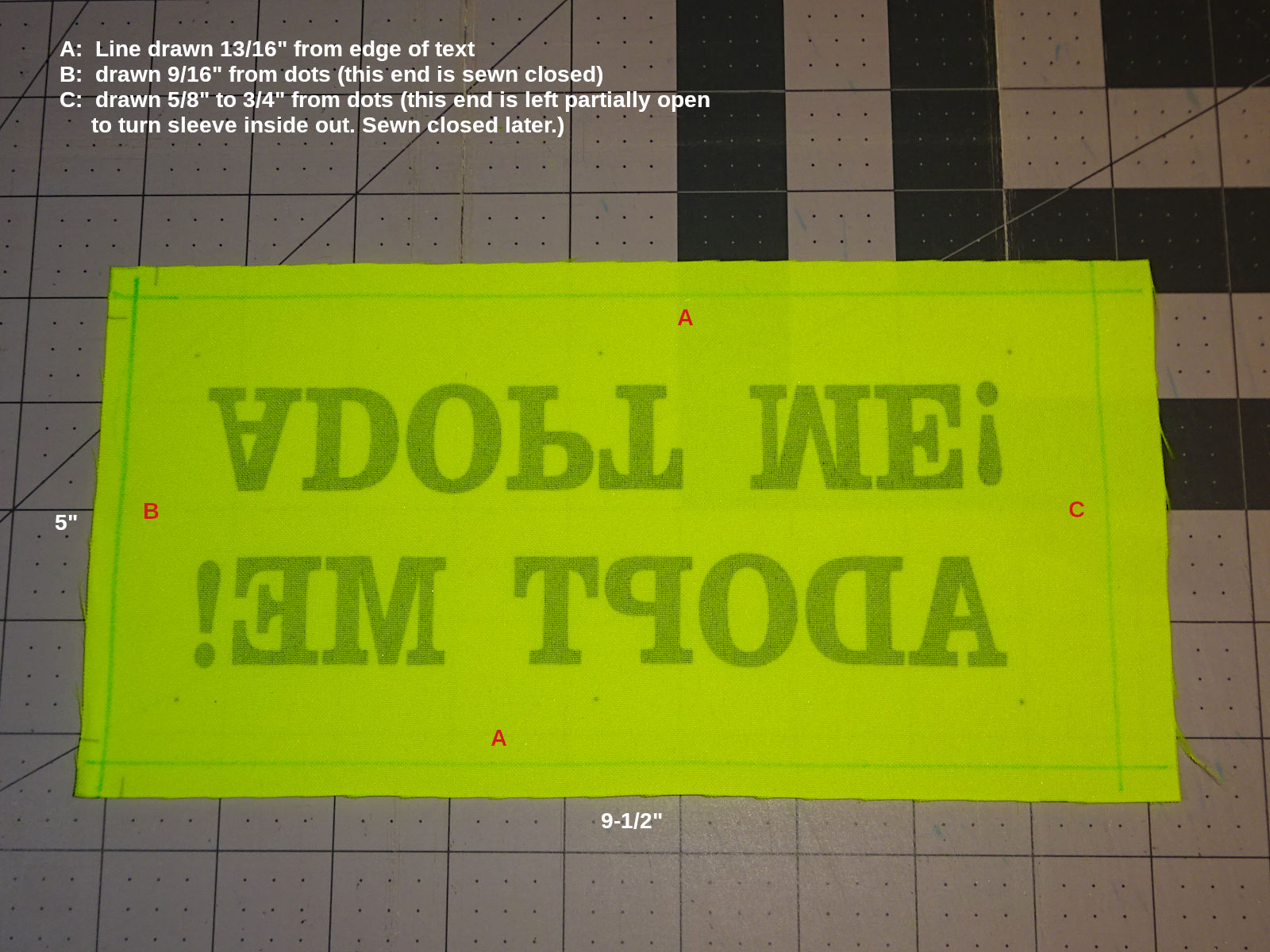 I was inspired to make and donate "adopt me" leash sleeves after seeing one made by Patience & Love.[1] Based upon that sleeve, I targeted these dimensions:
