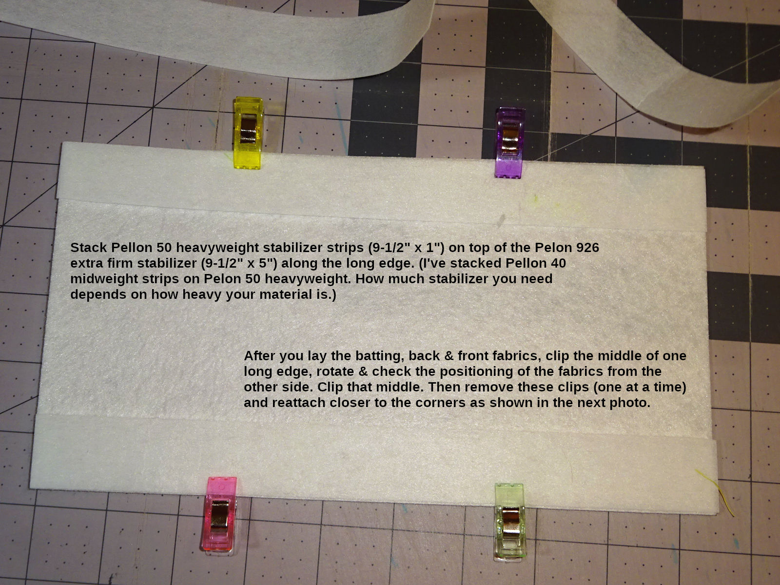 - Pellon 50 stabilizer 1" strips laying flush along the long edges. (Or Pellon 40 if I need less rigidity along this edge)
