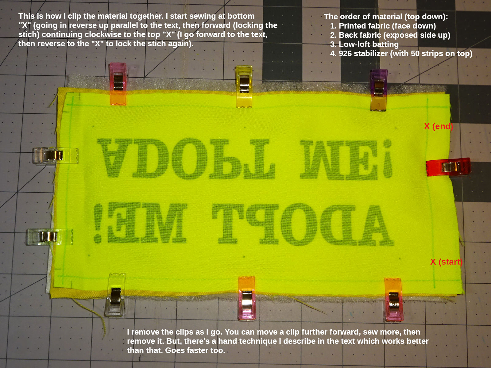 Next, I clip the center of the long-edge facing me; rotate the material 180 degrees & check the positioning from that side. (Clip that center, then proceed to re-apply the first four clips. Check the positioning again. Then palm-flatten the material & re-apply the long-edge clips to take the slack out of the material - make it "taught" as described in the sewing machine section above. Finally, I apply the short-edge clips.):
