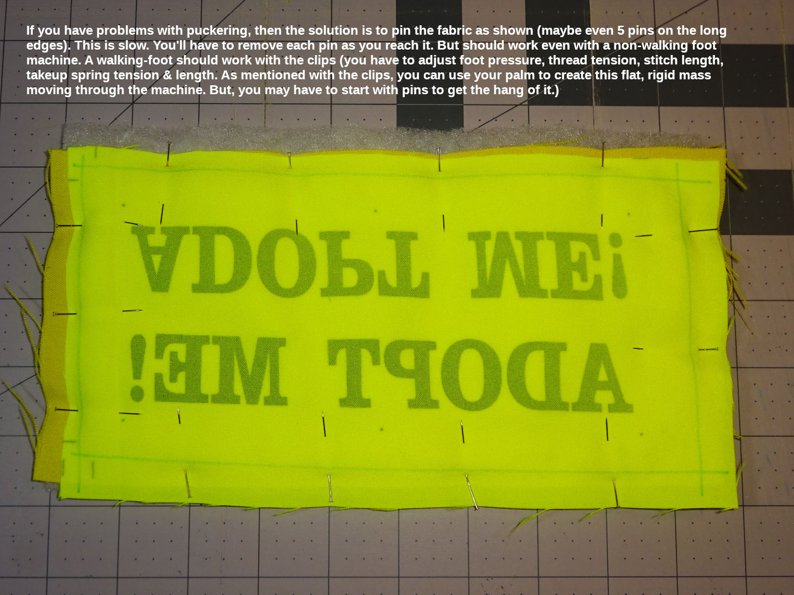 That goes slower. You can sew over the pin, but they'll bend & become hard to reuse (I used the thinnest pins I could find, for lace or appliqué? Thicker needles might not bend, but might leave holes in the face of the sleeve?). Your machine's needle may break if it hits a pin. It goes slower removing them compared to removing the clips. But, this should work no matter what kind of machine you have, or how dialed-in it is.