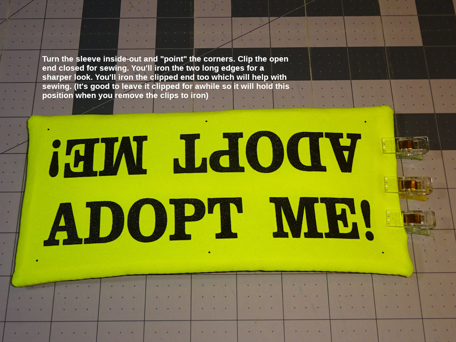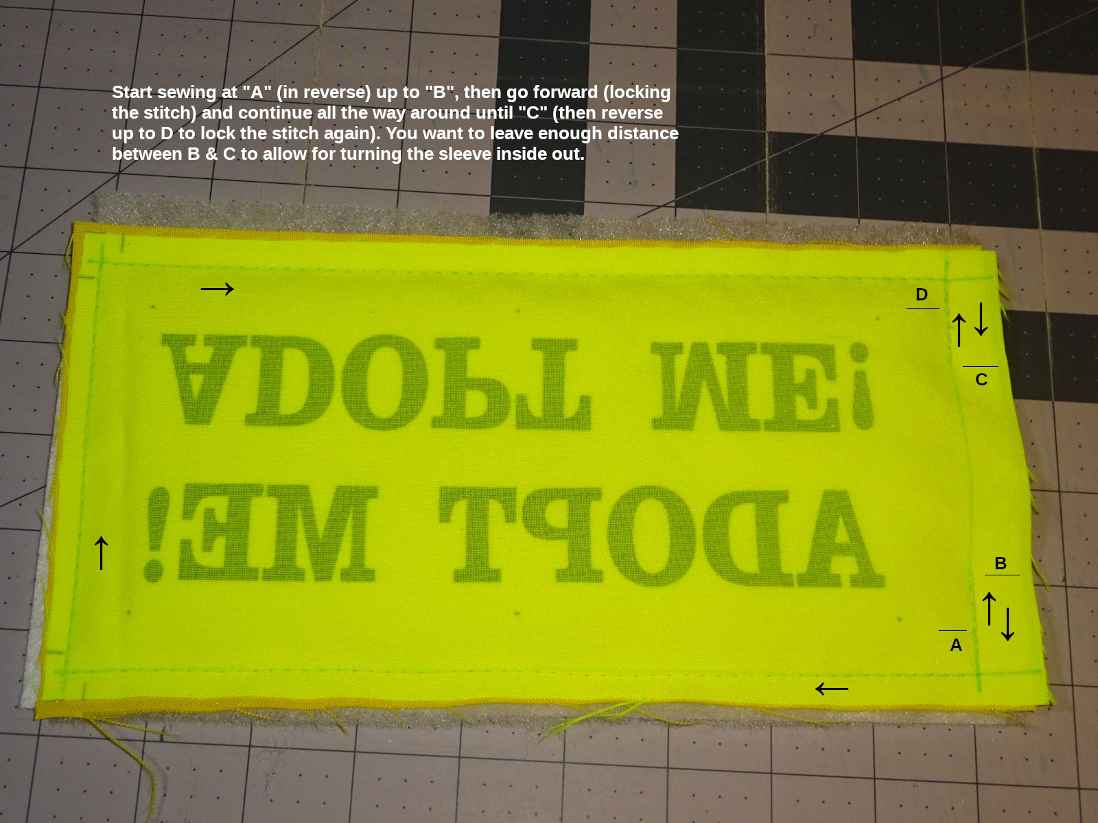 Note: When you turn the sleeve inside-out, the rear fabric's top side will be the exposed side. Fabric has a "finished" side which looks nicer (the unfinished side can look coarser). I like the unfinished side to be the exposed side on the back of the sleeve. It looks more like "the back," and the coarser finish might even grip the leash better?