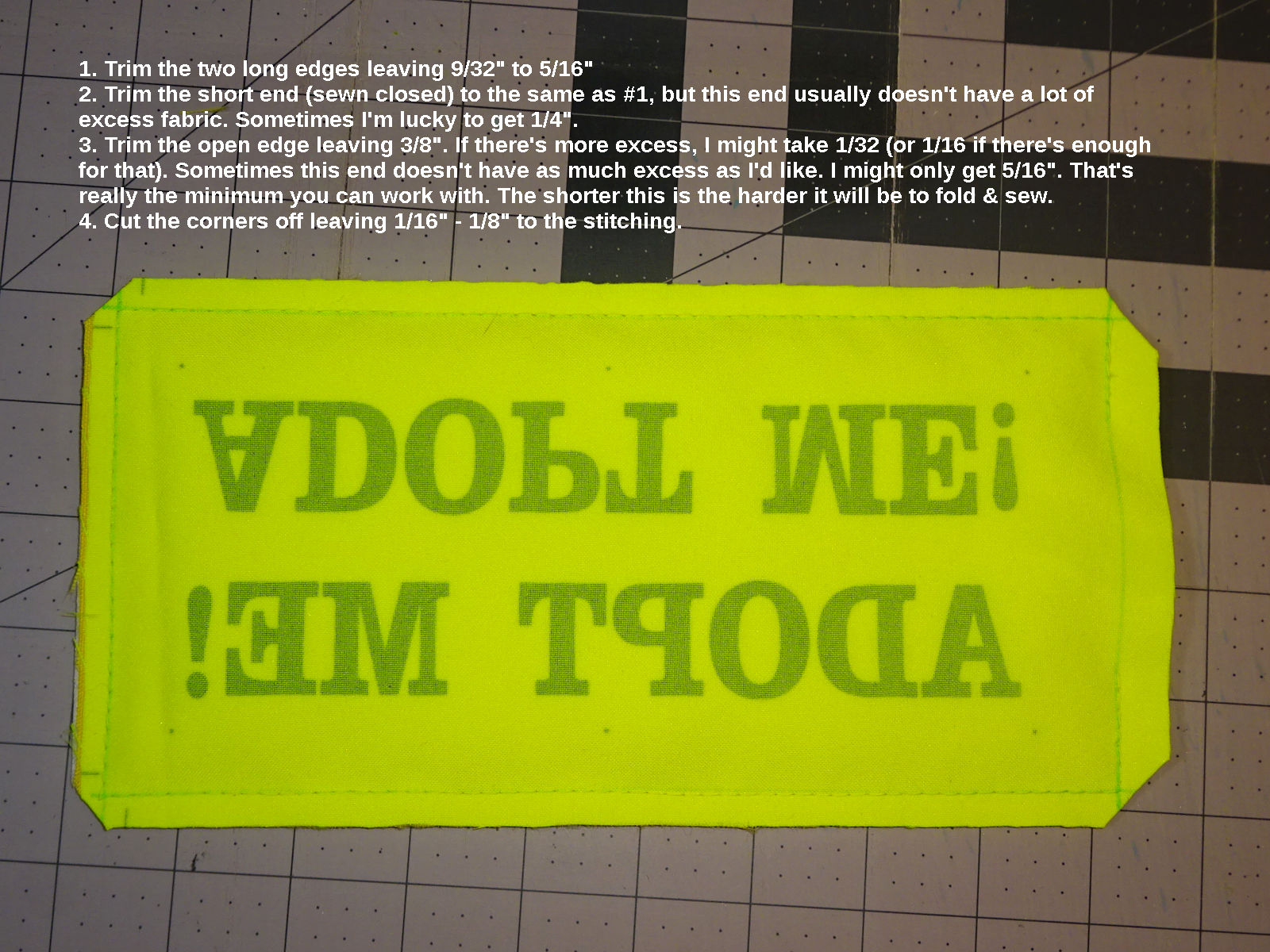 After sewing, I trim the two long edges to be 1/4" + a bit more (1/32" to 1/16") past the stitches. I trim the short edge (sewn closed) to be 1/4" (a hair more depending on how much there is to work with. Sometimes this end is a little short for me due to the way I shrank the 6-sleeve artwork.). I trim the other short edge (left open) to 3/8" or a hair (1/32") motr. Being a little longer helps with folding it inside & sewing closed. 1/4" works if that's all you have. But, if you have more, it's easier to fold and sew closed: