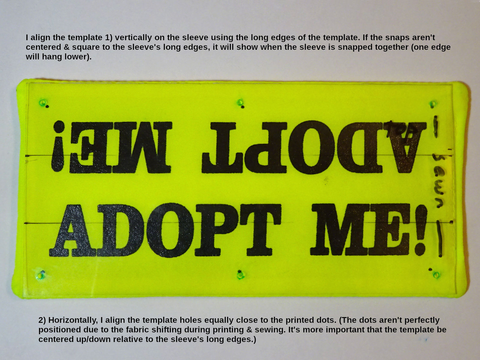 I added dots to the silkscreen thinking this would be simple & and timesaving. Unfortunately, the fabric can shift when silkscreening & sewing. (I screened multiple sleeves onto a large piece of fabric. Printing just 1 or 2 with a small screen might work better. But, even if the printed dots came out perfectly positioned, you'd still have to draw the sew lines perfectly square to the printed dots, and perfectly spaced around them.). I realized trying to use printed dots is starting at the wrong place. Only the snaps need to be perfect. The sleeve can be a little off (and will be. It won't be noticed if the snaps are position squarely & centered on the sleeve.).