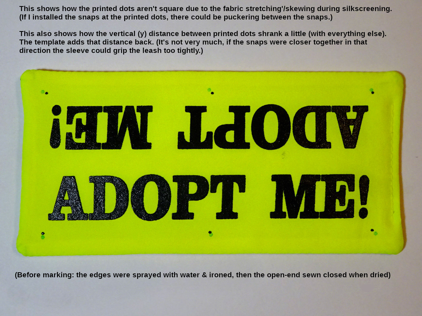 You can see the significance of getting the snaps square to each other. If I installed the snaps at the printed dots they wouldn't be square, could be puckering when snapped together. (The above also shows how the template increases the distance between the snaps in the y-axis. Remember that I had the artwork srunk 4%, but I wanted to retain this distance so the sleeve would have the same grip around the leash. If the snaps were installed on the dots, it would grip the leash tighter. I corrected for that in the template.).