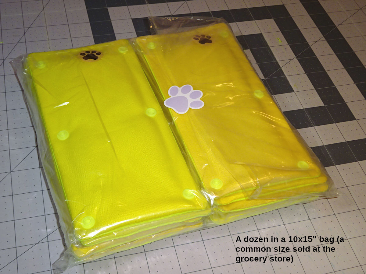 I found 5x10" 1.0mil flat poly bags at a good price. These work well for the sleeves. I close the bag with 1" stickers found on Amazon (paw print). I package a dozen of those into a larger bag:
