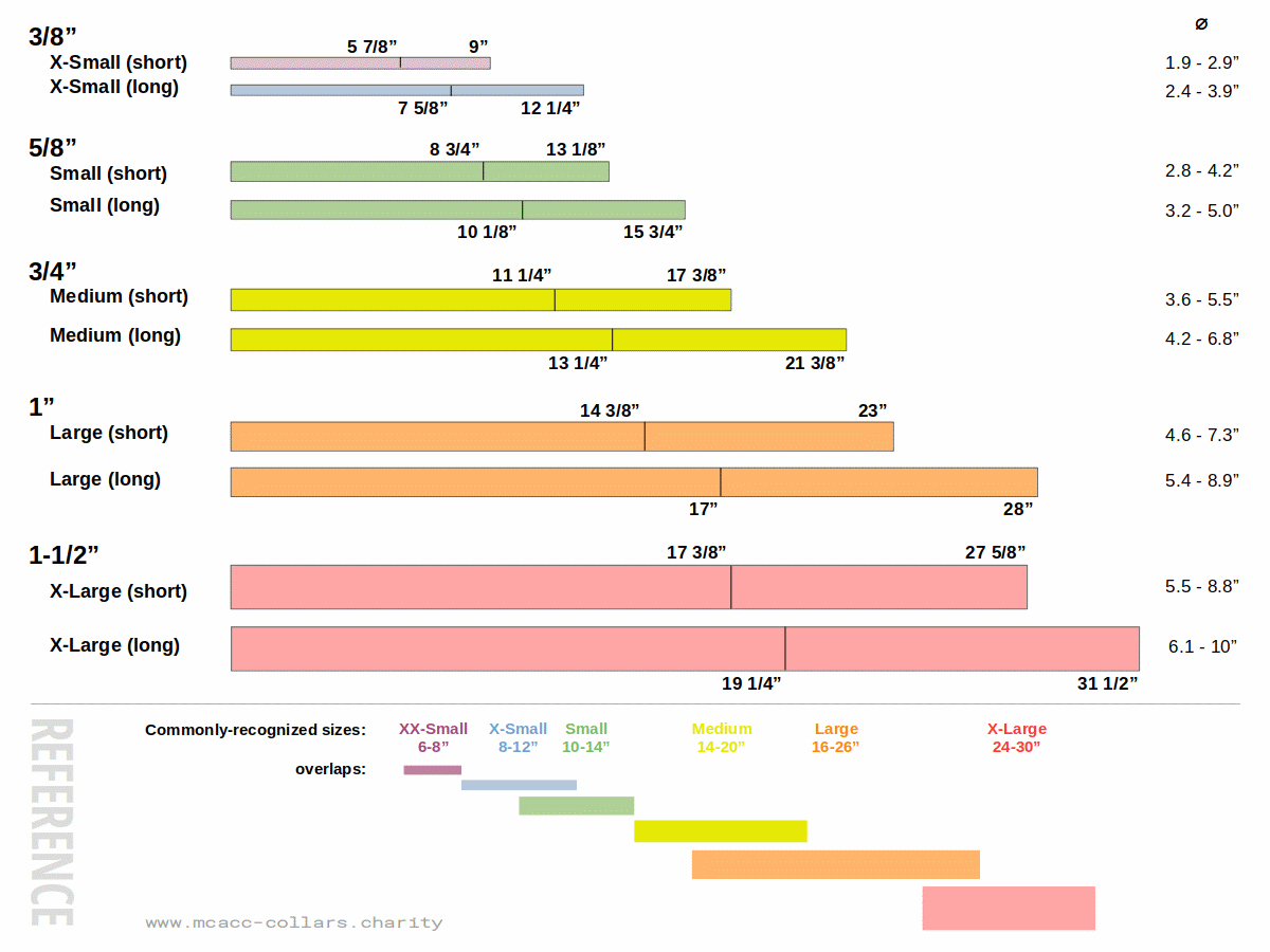 Those sizes are based upon what appear to be commonly-referenced sizes[1] (depicted at the bottom of the chart as "reference"). I make short & long versions of each size for more flexibility in fitment. (I.e., you can put a narrower, lighter-weight collar on larger dogs who pull less. Heavier, wider collars on smaller dogs who pull more.).
